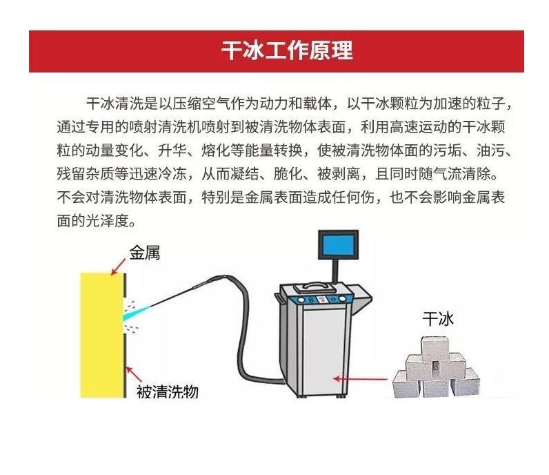 在用干冰清洗物体的过程中,干冰颗粒会钻入物体表面的污垢间隙,然后在千分之一秒内实现快速升华,其体积会瞬间膨胀600-800倍,然后污垢可以迅速剥离物体表面,从而达到良好的清洗效果,达到去除污垢的效果。